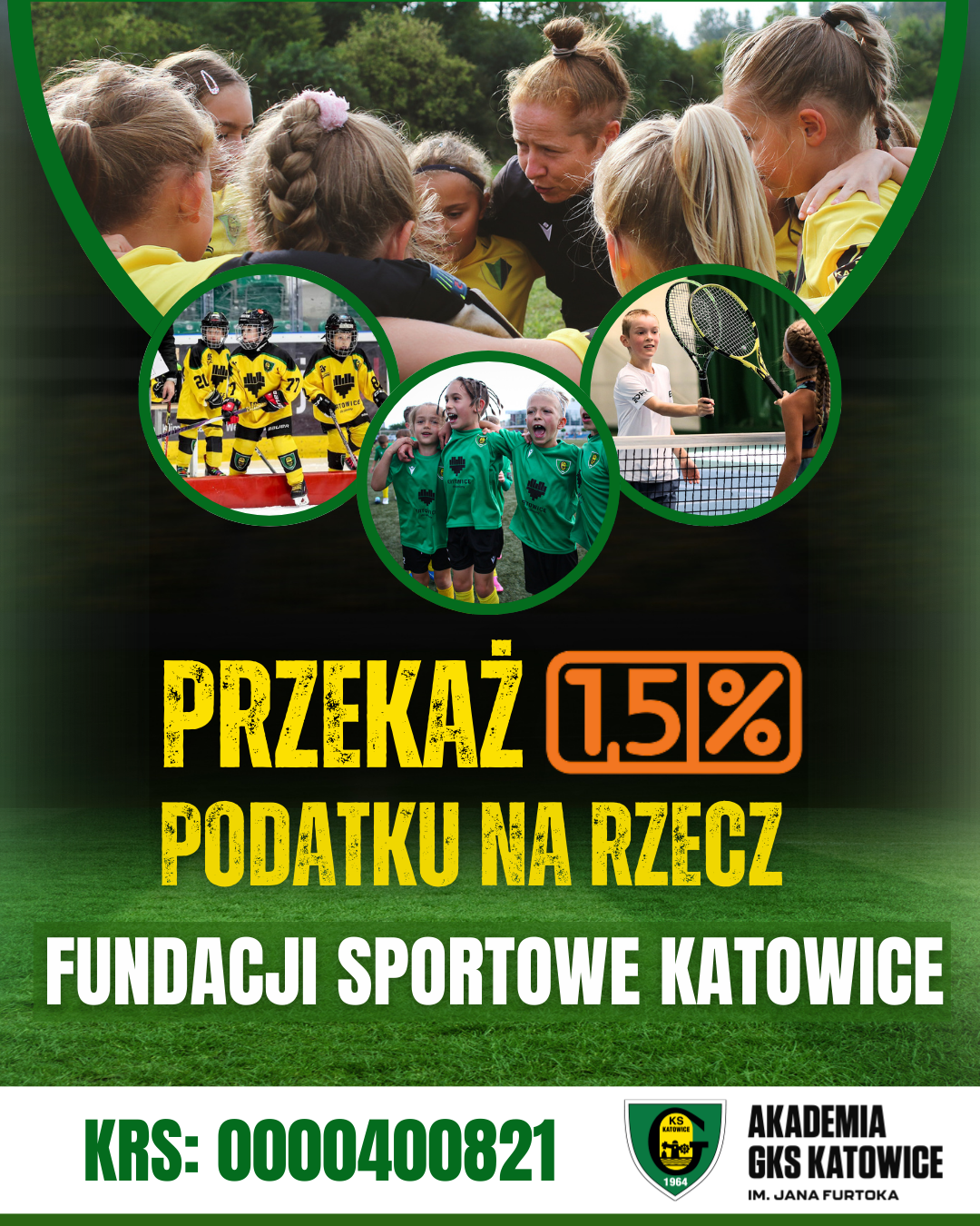 Rozliczając swój PIT możesz wspomóc Fundację Sportowe Katowice, dzięki przekazaniu 1,5% podatku. Zebrane w ten sposób środki finansowe zostaną przekazane na cele statutowe w tym min. na sprzęt sportowy i transport.
